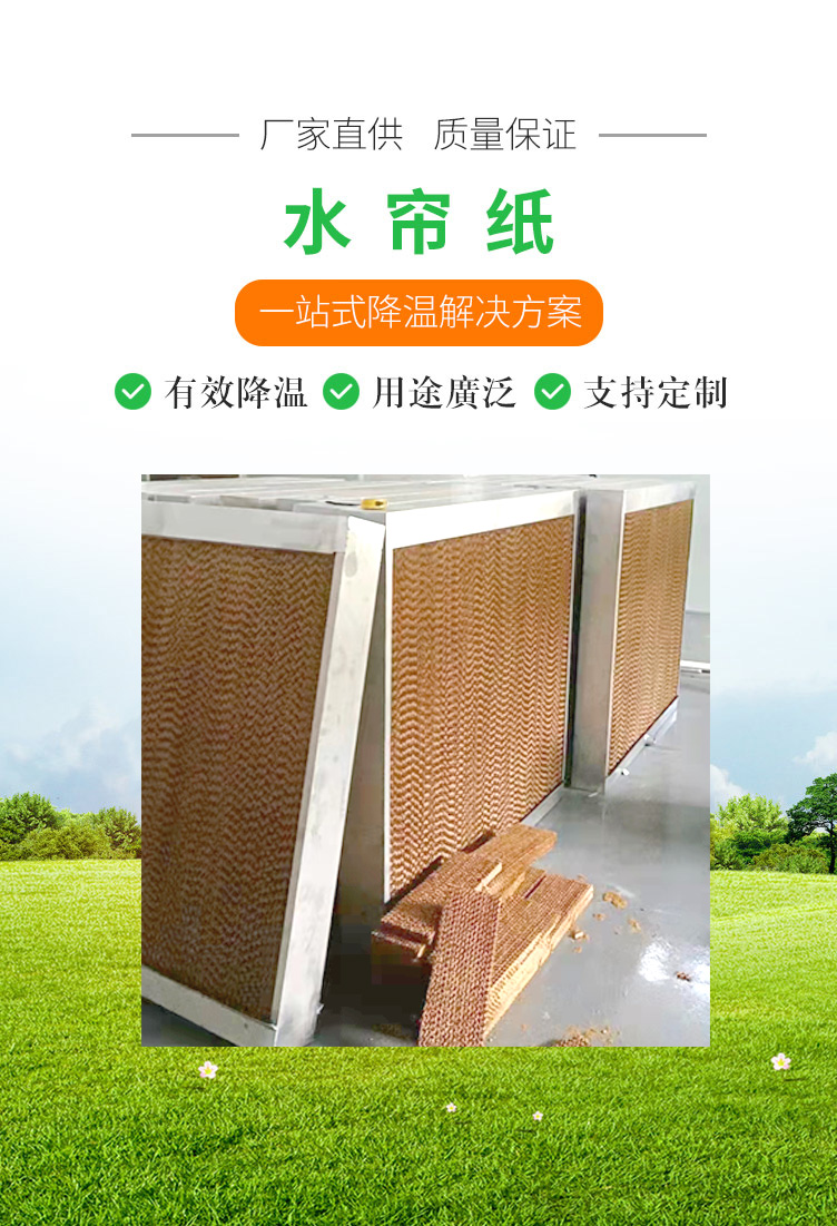 公司致力于發展提高節能環保領域及通風降溫系統工程,適用各類工廠車間,關殖場,網吧降溫需求。我司水簾片,濕簾墻質地堅硬,抗壓力高,吸水性好,不易變形,不縮水。