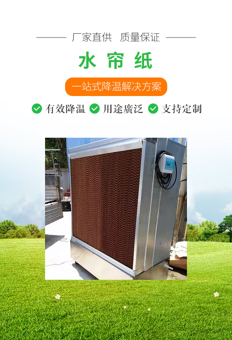 公司致力于發展提高節能環保領域及通風降溫系統工程,適用各類工廠車間,關殖場,網吧降溫需求。我司水簾片,濕簾墻質地堅硬,抗壓力高,吸水性好,不易變形,不縮水。